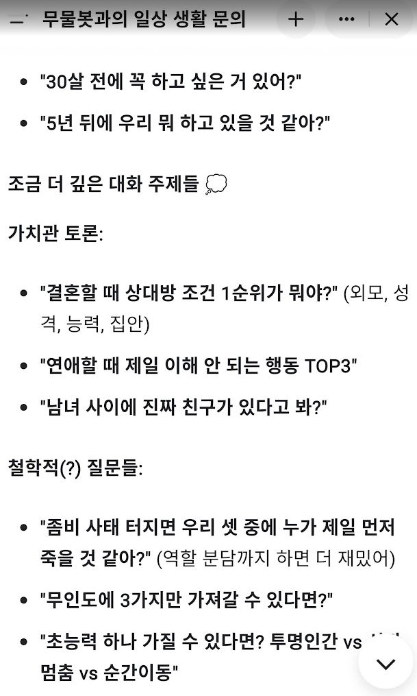 자주만나니까 할게없어서, GPT한테 무슨 토크할지 추천받았습니다.